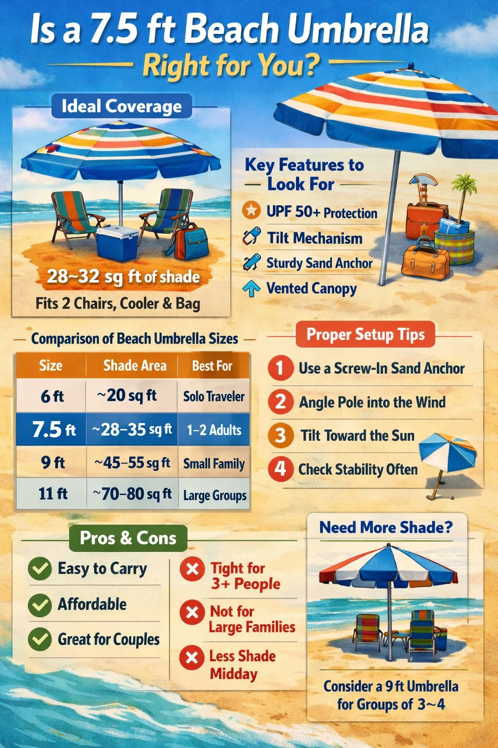 Krátka odpoveď: plážový slnečník s dĺžkou 7,5 stôp je z dobrého dôvodu najobľúbenejšou veľkosťou na trhu — pokrýva približne 28 až 32 štvorcových stôp zatienenej plochy, čo stačí na dve plážové ležadlá, chladničku a tašku bez toho, aby niekto sedel na priamom slnku. Ak nakupujete sami alebo vo dvojici, 7,5-metrová strieška je ideálnym miestom medzi prenosnosťou a praktickým pokrytím. Pre skupiny troch alebo viacerých sa možno budete chcieť pozrieť na možnosti s dĺžkou 9 stôp, ale pre väčšinu výletov na pláž je to 7,5 stôp.