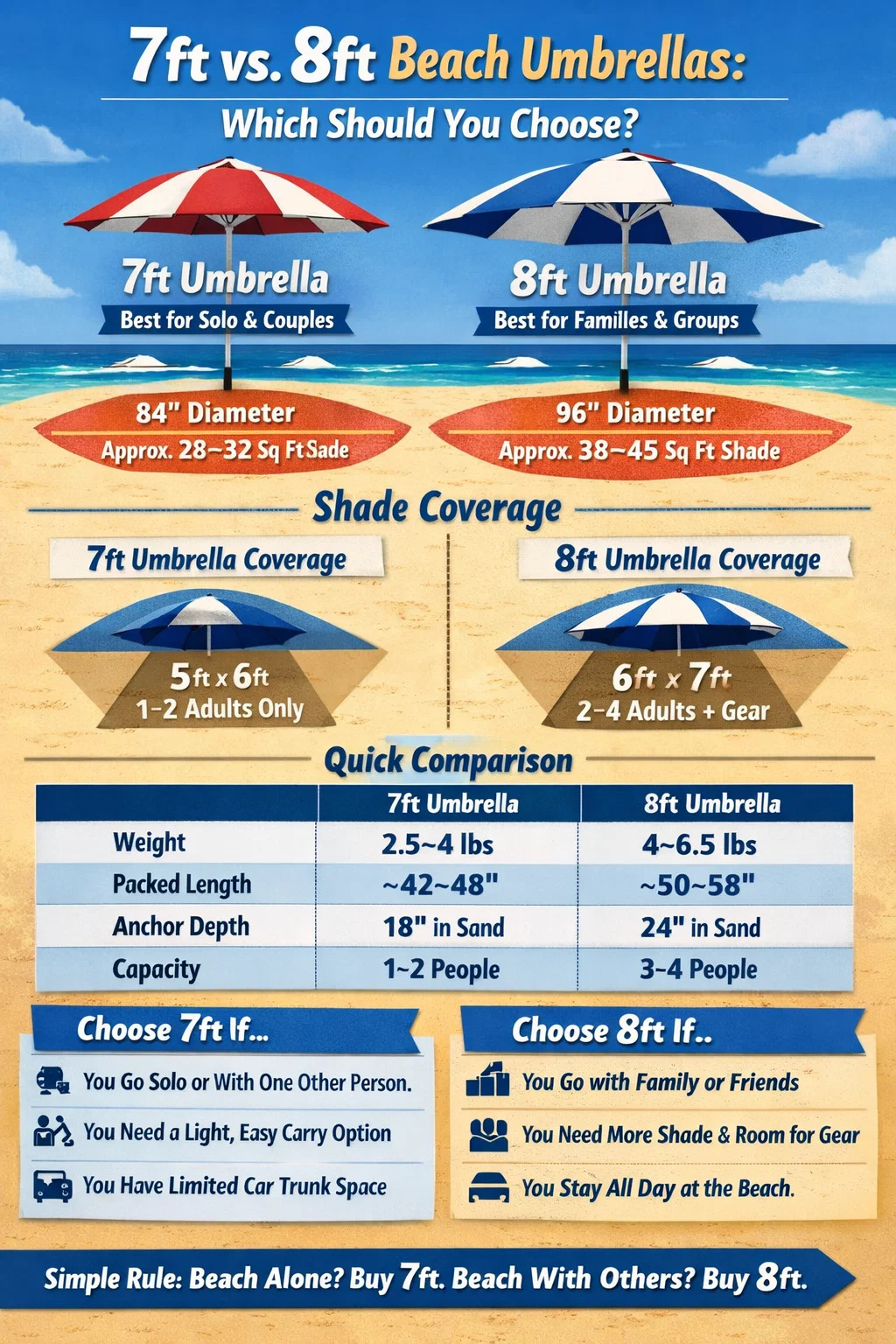 Ak kupujete plážový slnečník a rozmýšľate, či je lepšia voľba 7 stôp alebo 8 stôp, tu je priama odpoveď: plážový slnečník s dĺžkou 8 stôp je lepší pre skupiny 3 alebo viacerých ľudí, zatiaľ čo slnečník s dĺžkou 7 stôp je múdrejšou voľbou pre jednotlivcov alebo páry, ktoré uprednostňujú prenosnosť. Rozdiel v priemere vrchlíka medzi týmito dvoma veľkosťami sa premieta do zmysluplnej medzery v použiteľnom tieni – a na tejto medzere záleží, keď sa snažíte udržať celú svoju rodinu v chlade v horúcom letnom popoludní.