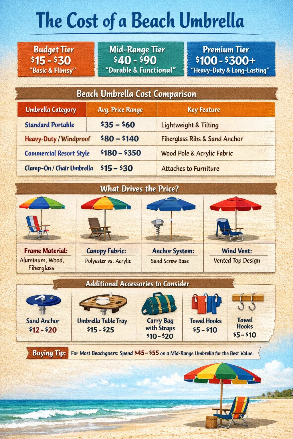 Ak mierite na breh, štandardné, spoľahlivé plážový slnečník zvyčajne stojí medzi 35 a 75 dolármi . Táto cenová kategória sa vo všeobecnosti vzťahuje na modely s vrchlíkom 6 až 7 stôp, základným naklápacím mechanizmom a striebornou vrstvou ochrany proti UV žiareniu. Trh je však široký; Základné "jednorazové" dáždniky nájdete v miestnych obchodoch na promenáde už za menej ako 15 až 25 dolárov , zatiaľ čo špičkové, komerčné tienidlá navrhnuté tak, aby odolali silnému vetru, môžu dosiahnuť ceny 150 až 300 USD alebo viac .