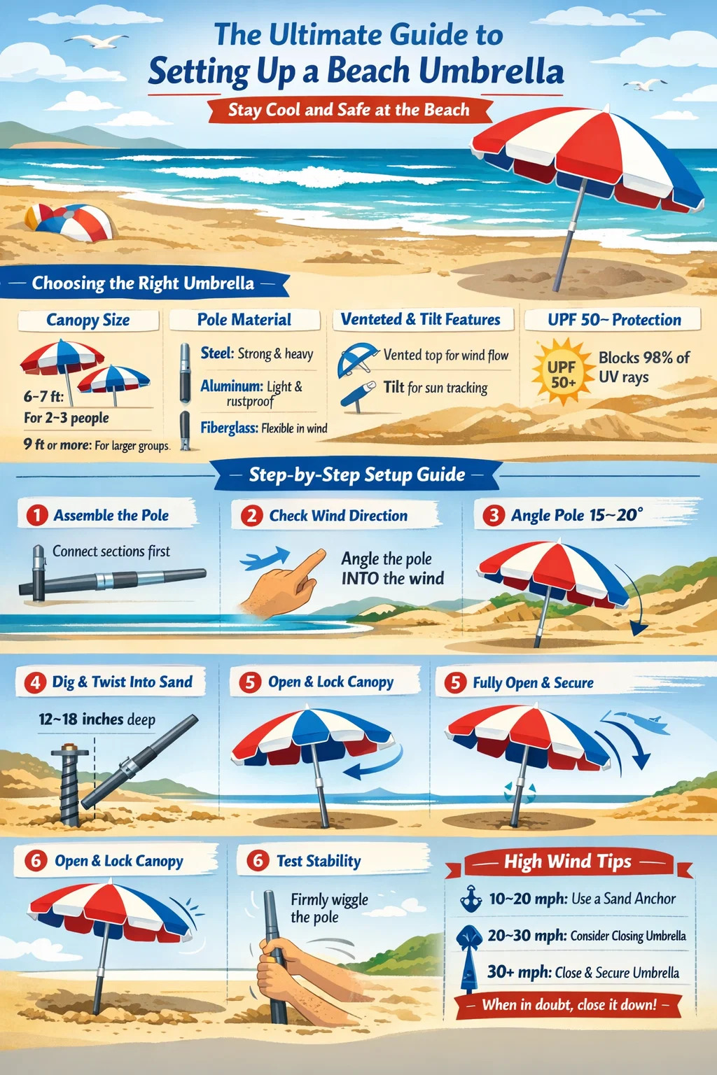 Táto príručka podrobne popisuje každý krok – od výberu správneho plážového slnečníka až po jeho stabilitu pri nárazoch nad 20 míľ za hodinu – takže môžete tráviť menej času zápasením s vybavením a viac času vychutnávaním si vody.