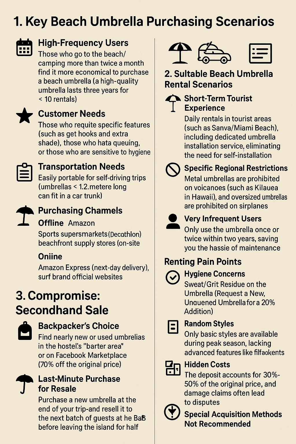 Krátkodobé turistické skúsenosti: denné prenájom v turistických oblastiach (napríklad Sanya/Miami Beach), vrátane špecializovanej inštalačnej služby dáždniky, čo eliminuje potrebu sebainštalácie.
