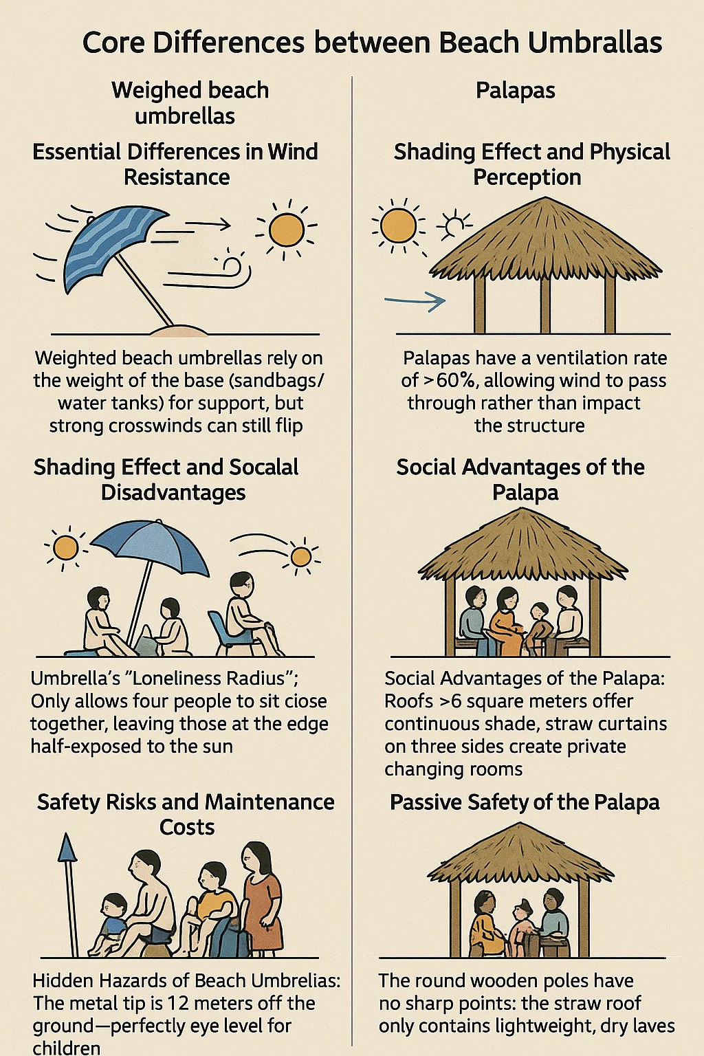 Obmedzenia ochrany pred slnkom na pláži: tieň pod dáždnikom sa posúva s uhlom slnka, čo si vyžaduje časté úpravy. Poter striebra odráža tepelné žiarenie zo zeme neefektívne, takže dokonca aj v poludnie, keď je povrch piesku 60 ° C, môže teplota pod dáždnikom stále prekročiť 40 ° C. Palepas ponúka prírodné chladenie: Zhrusnuté palmové listy skôr absorbujú teplo, ako odrážajú, udržiavajúc konštantnú hladinu vlhkosti (meranú na pláži, o 3-5 ° C nižšie ako pod dáždomou); Celá slnečná slnečná slnečná voda nevyžaduje žiadne úpravy.